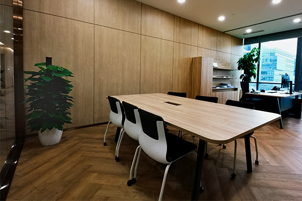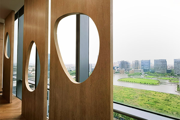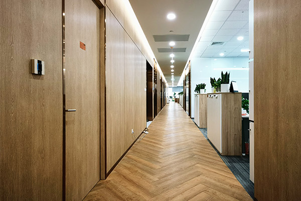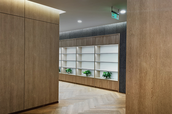 描述:办公室的装修风格看似原木工业风,但更为精致细腻,注重细节。窗户上的木制格栅采用LX的高品质木纹产品制成。在办公室走廊区域,LX木纹膜与同色的人字形地板相搭配,墙壁和地板颜色一致,使空间更具层次感。会客区则采用LX木纹与传统的黑色石材相搭配,别具一格。